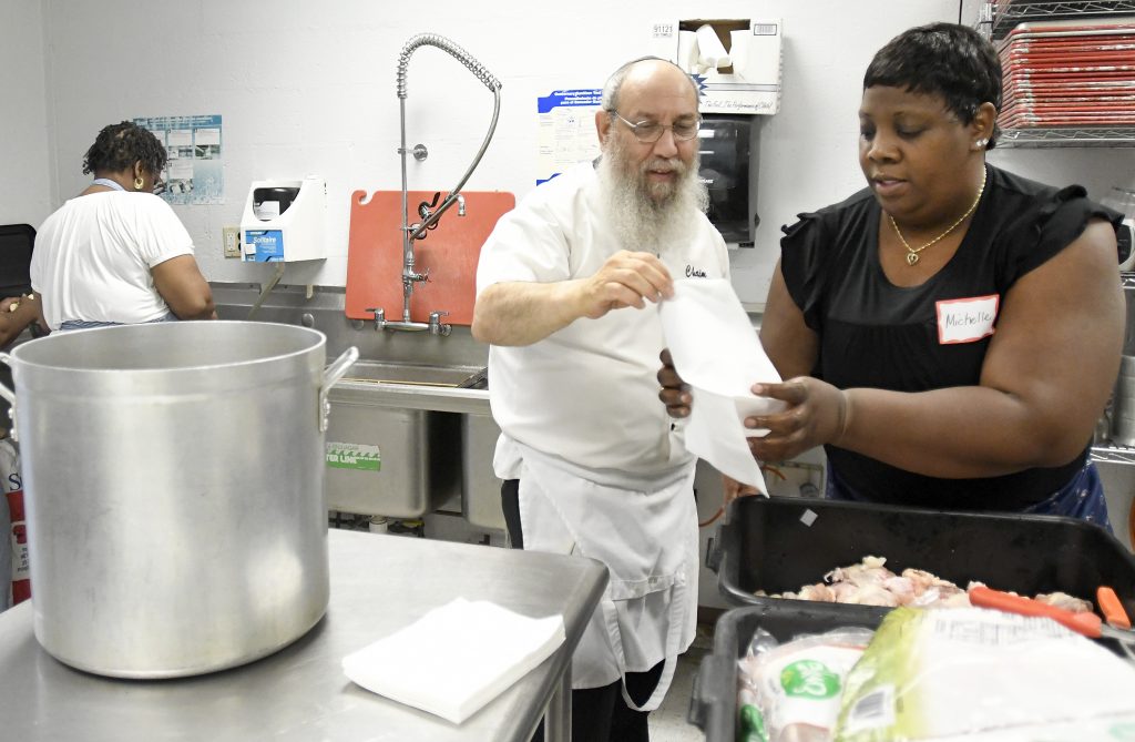 That spark of fellowship turned out not to be a photo-op one-time deal. For about three hours on Thursday night, July 25, women from Beth Tfiloh and Liberty Grace gathered in the synagogue’s Crane Multipurpose Room to cook up an interfaith feast, featuring their favorite traditional African-American and Jewish recipes.