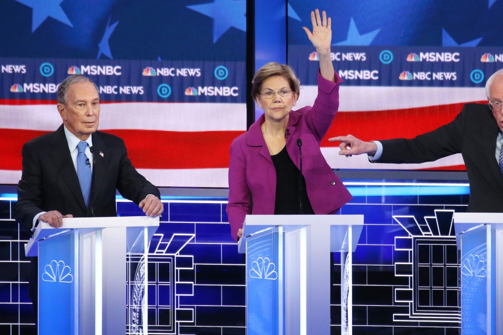 Former New York Mayor Michael Bloomberg (left) was under attack from Elizabeth Warren, Bernie Sanders and the other Democratic presidential candidates at the debate Feb. 19 in Las Vegas. (Mario Tama/Getty Images, via JTA)