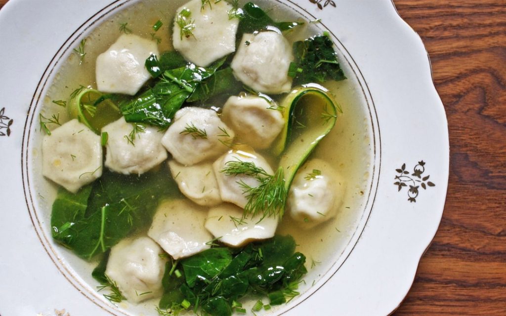 My personal favorite way to eat pelmeni is in a bowl of homemade chicken broth, with a good amount of fresh greens added to it like kale or turnip tops. I always garnish the pelmeni with an excessive amount of fresh dill.
