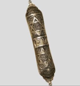 An early 20th-century silver mezuzah case from Jerusalem’s Bezalel Academy of Arts and Design.