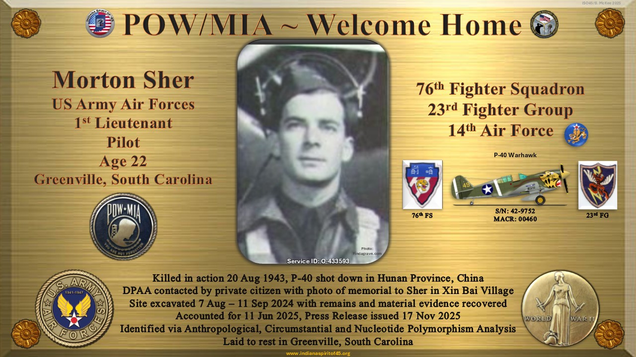 Sher was piloting a P-40 Warhawk over Hunan Province in central China when shot down by Japanese bombers on Aug. 9, 1943. He was 22. His mother, Celia, received Sher’s Purple Heart that same year.