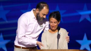 Rachel Goldberg-Polin and Jon Polin become emotional as they arrive to speak on stage during the Democratic National Convention in Chicago in 2024. (Chip Somodevilla/Getty Images, via JTA)