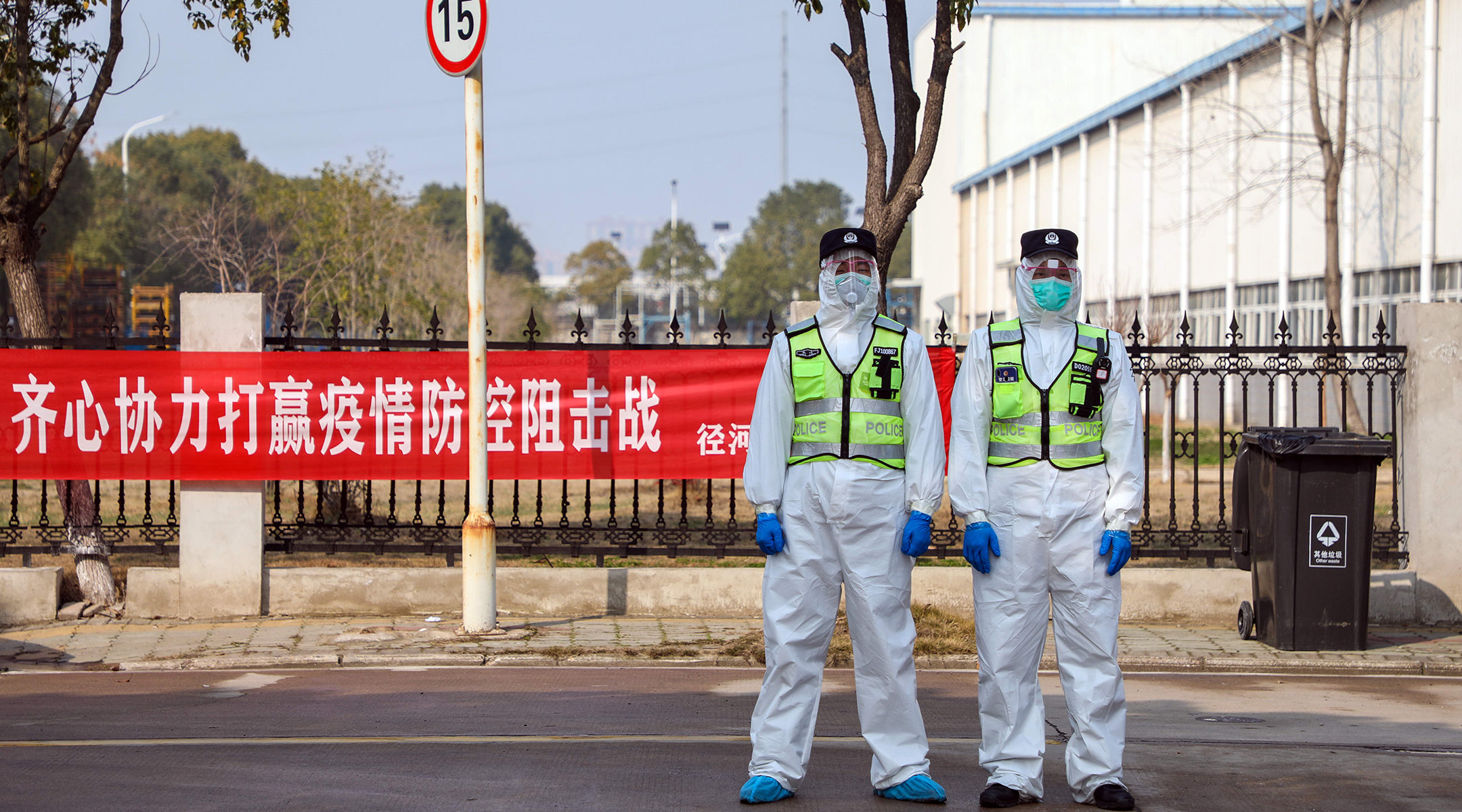 Two policemen stand guard outside a hotel in Wuhan in central China's Hubei province. (Feature China/Barcroft Media via Getty Images, provided by JTA)